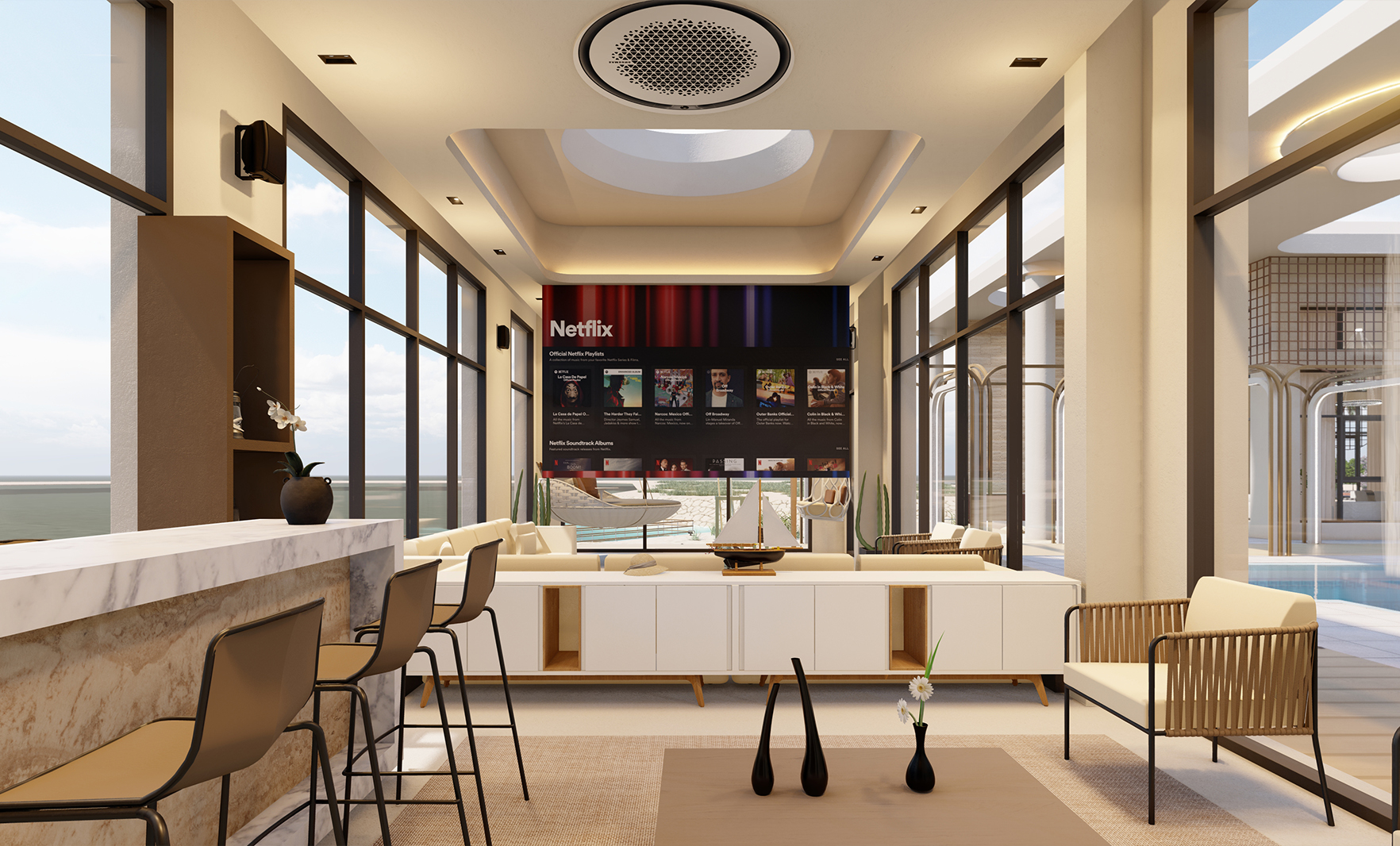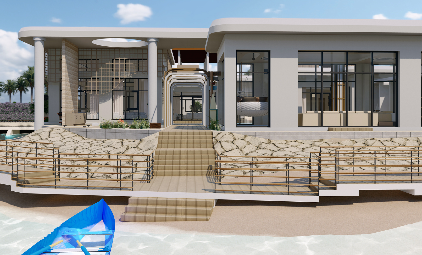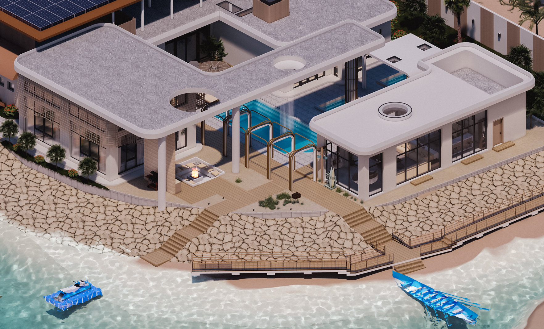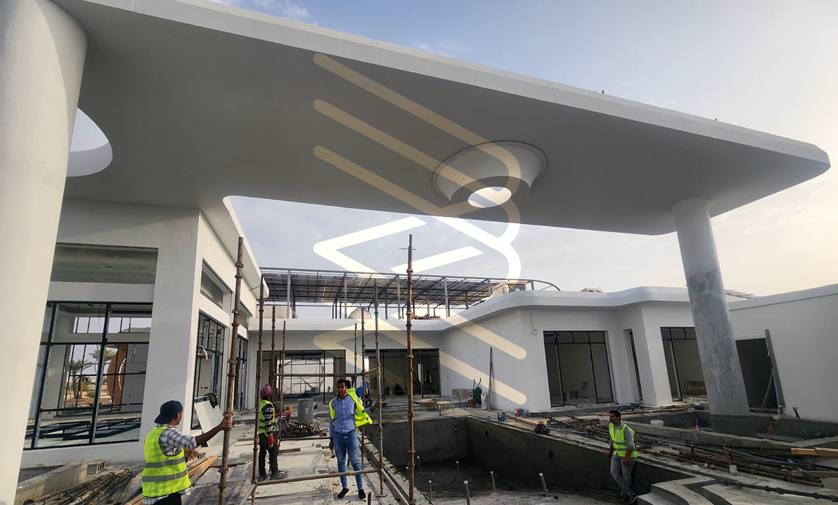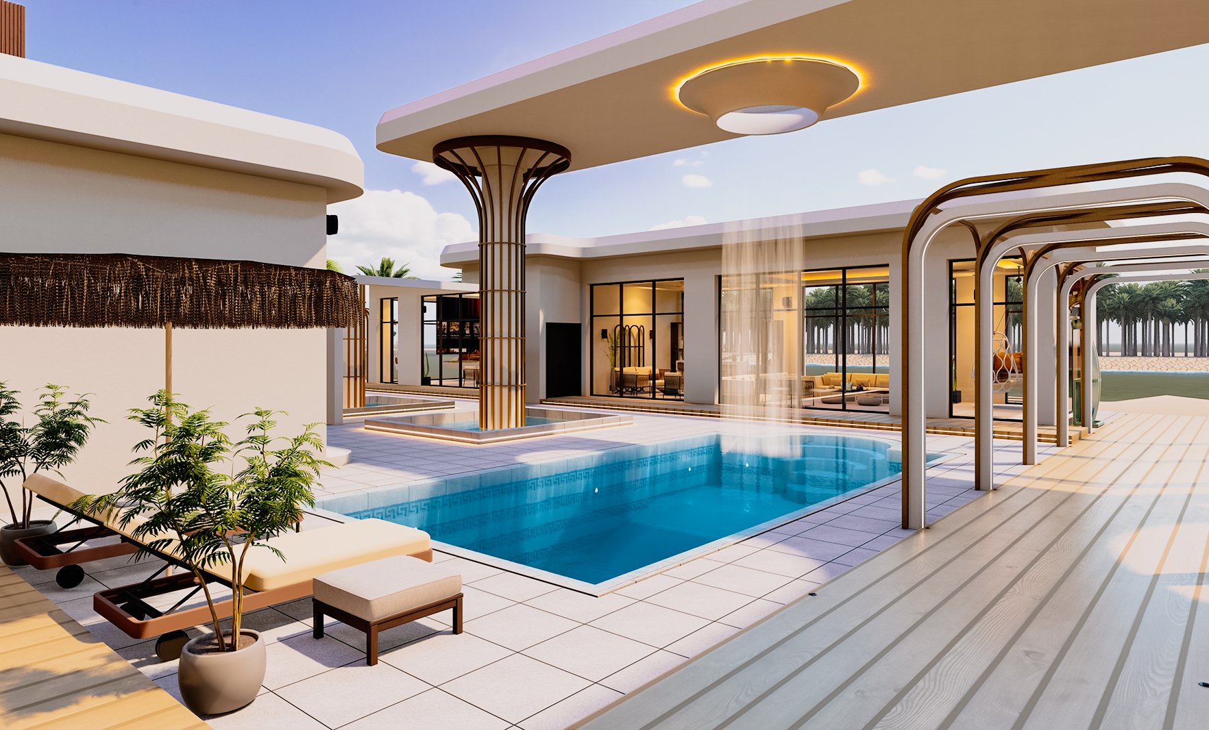 PROJECT INFORMATION PROJECT NAME: Chalet St Tropez ARCHITECT: RAM ARBIA LOCATION: Ishbiliya Al Khobar Share: Chalet St Tropez The project includes 2 bedroom, majles, party hall with double height, family hall, dining area, open & dirty kitchen, maid room, pool, jacuzzi, outdoor sitting area.